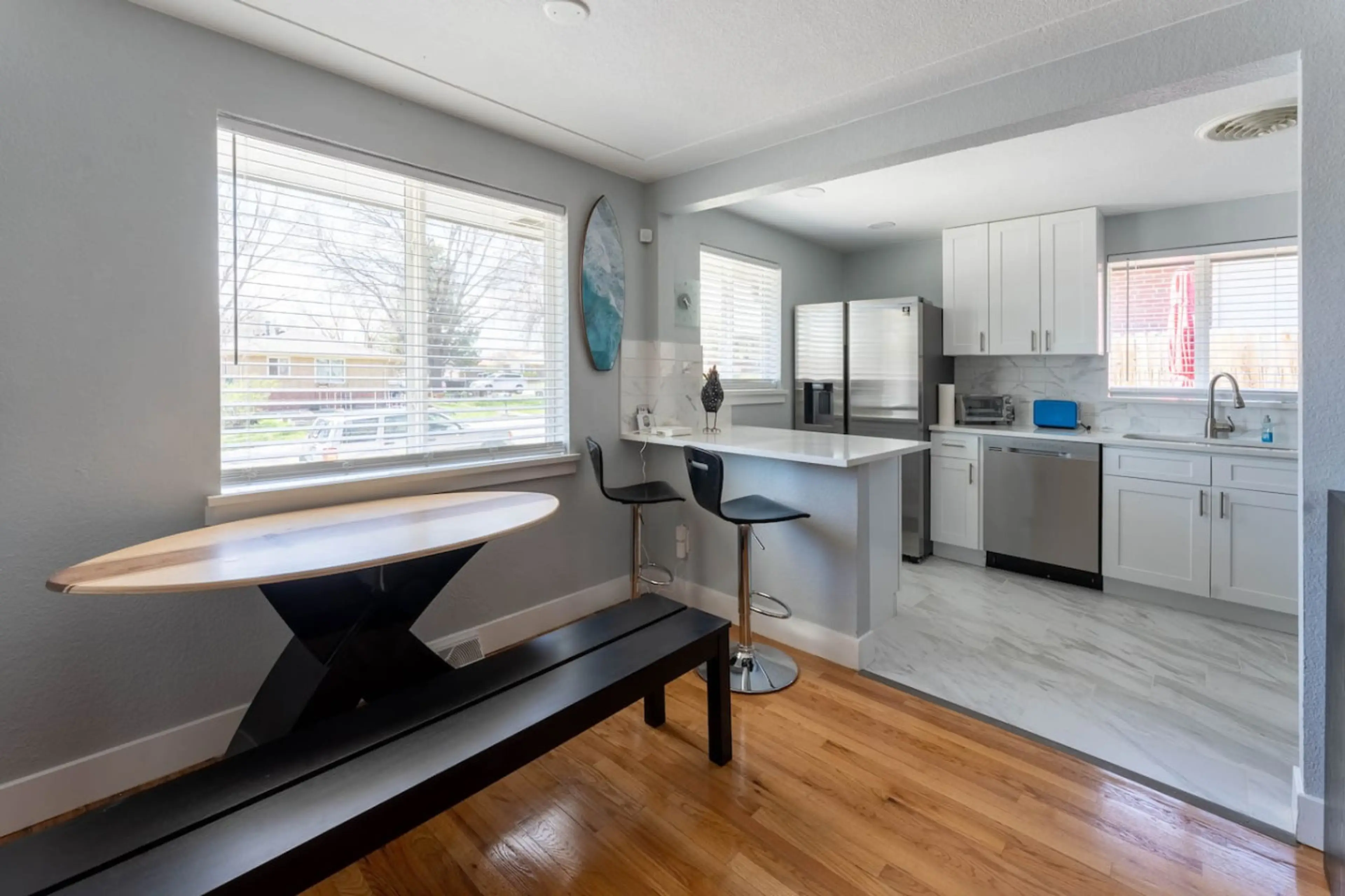 Negative: Lack of electrical outlets. Furniture in bedrooms doesn’t leave much room to move around. It was listed as a single home but is actually a duplex.